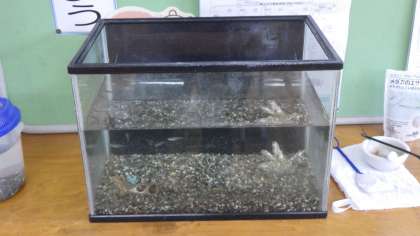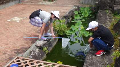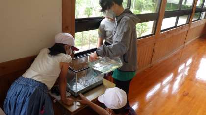メダカの観察のために水槽を準備し、校内の池でメダカ捕獲大作戦!無事に、捕まえることができました。