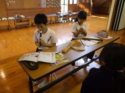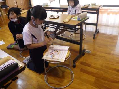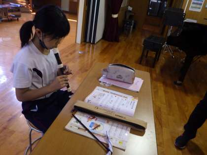 3・4年生音楽。 リコーダーを一人ずつふいています。 みんな上達しています。