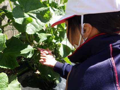 上:自立単元。きゅうりがとれました。結構順調に育っています。