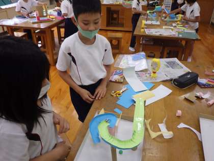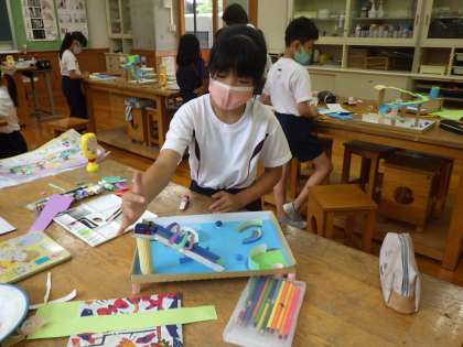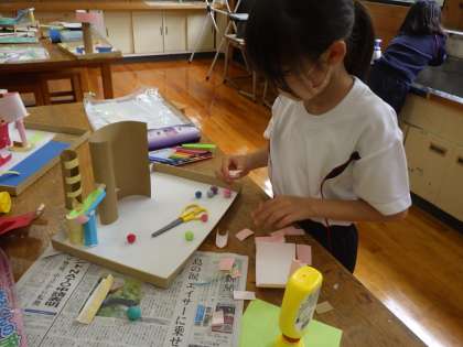 3・4年図工。 玉をころがすための仕掛けを作っています。
