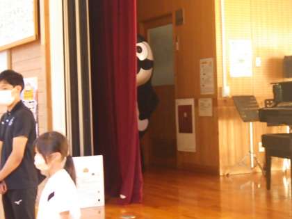児童の交通安全並びに不要な携帯電話をリサイクルする啓発活動を行っている、グランパスくんが本校に来てくれました。