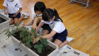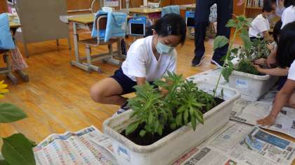 ホウセンカ、ヒマワリ、オクラ、ダイズを育てています。