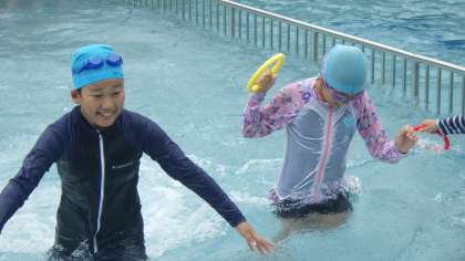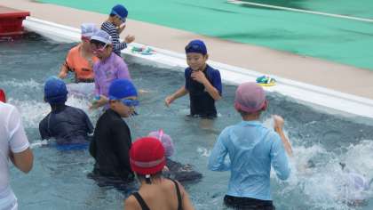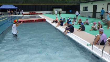 通常、昼放課に行っている全校遊びを今回はプールで行いました。