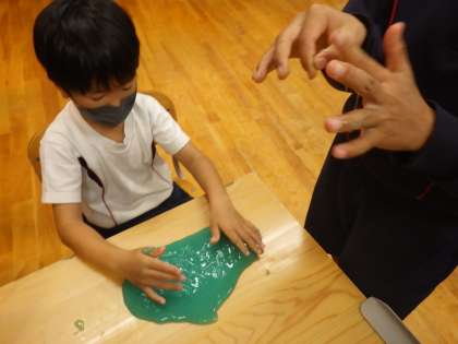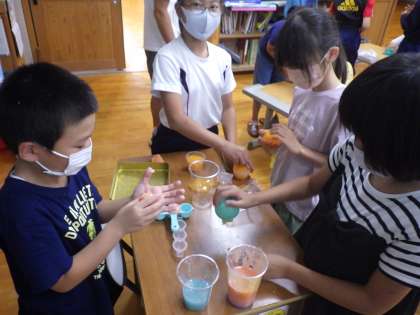 1・2年生が作ったスライムを他の学年の子たちも楽しんでいました。