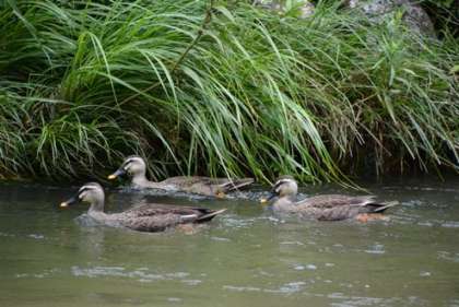 なんとカルガモ親子(大きさは同じですが親子らしいです)も一緒に川遊び。人がいても全く気にしていません。