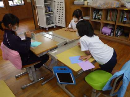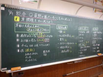 学校の草取りをするために、どんなことができるかみんなで意見を出し合いました。