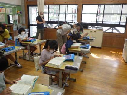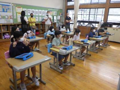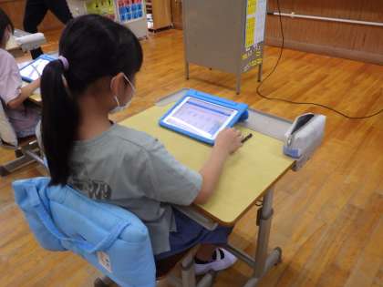 一画加えるとどんな漢字が完成するか。タブレットと漢字辞典を使って学習します。