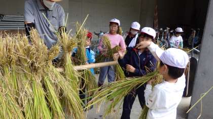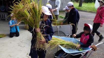 刈った稲は、はざかけをして乾かします。おいしいお米までもうすぐです。頑張ろう!