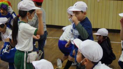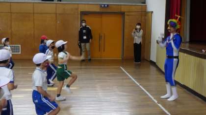 体育の授業です。おや、先生じゃなくて正義のヒーローが授業をやっていますよ。