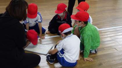 2時間目は字合わせ遊びです。 みんなで協力して文字を探しています。
