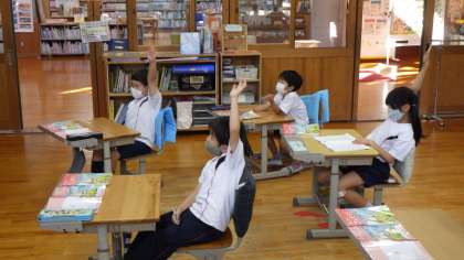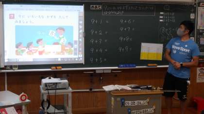 くり上がりのあるたし算の勉強をしています。前に出て、堂々と自分の考えを発表しています。