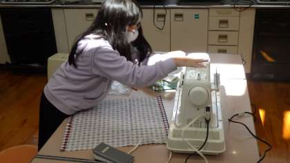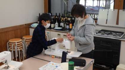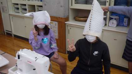 ミシンを使ってトートバッグを作っています。ミシンの扱いに悪戦苦闘しながら頑張っています。おや、このかぶり物をしている人は誰かな?