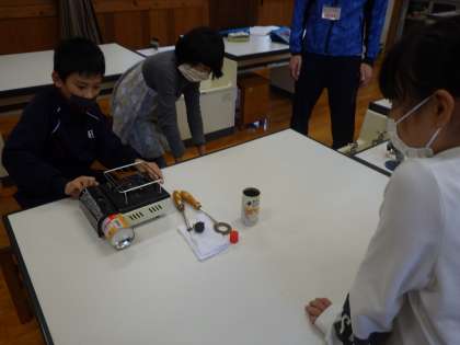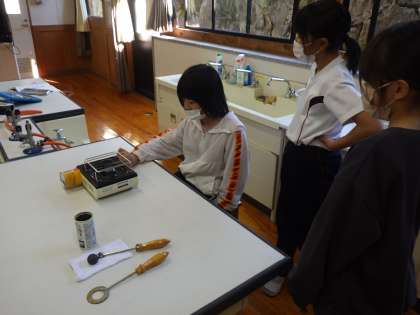 カセットコンロの使い方を試しています。こわがってひねることを躊躇している子もいました。ふだん、こうした器具を扱う機会が少ないのでしょうね。