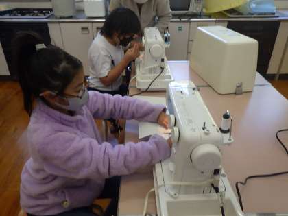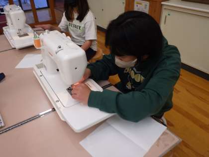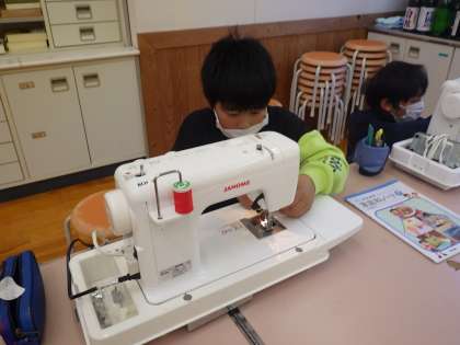 5・6年生家庭科。 下糸の通し方に苦労しています。