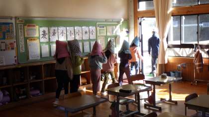 避難訓練。本日はもろもろの都合により、避難場所を全く別のところに変更しました。いわば抜き打ちと同じです。校長先生からは「天災は忘れたころにやってくる」の話をしました。