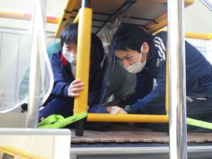 豊田市消防局から起震車「ぼうサイ君」が来て、実際の地震を体験しました。