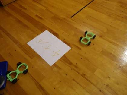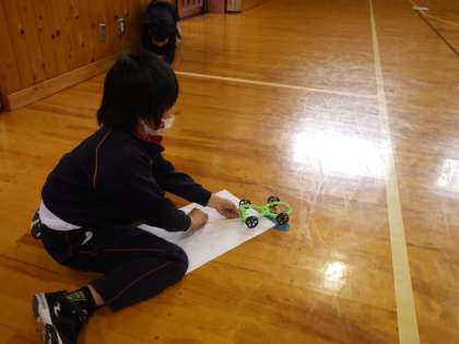ゴムで動くおもちゃで、国名が書かれたシートにちょうど乗るように調節して走らせます。