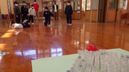 ボーリング算数です。トイレットペーパーの芯を使っています。爽快ですね。