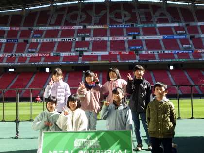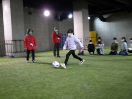 屋内練習場でボールをけります。ふわふわの人工芝です。