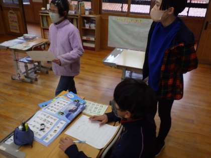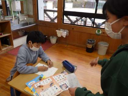 5・6年生外国語科。 英語で話したことを聞き取りメモをします。