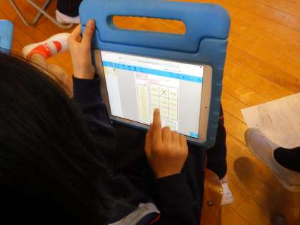 5年生以下で、送る会のリハーサルです。一人1台タブレットを使ったゲームをするようです。これもICTの有効活用ですね。