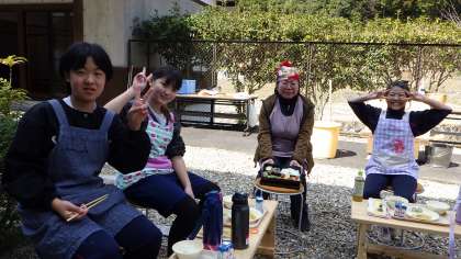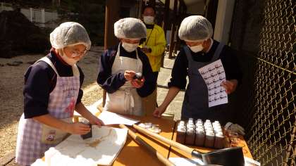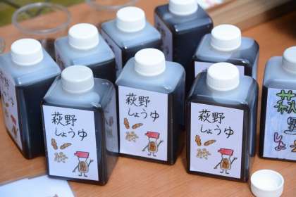 とれたての醤油を生醤油といいます。これをオリジナルステッカーのついた容器に入れて配ります。お昼はボランティアさんと一緒に屋外で食べました。