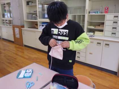 5・6年生家庭科。 一生懸命巾着を作っています。