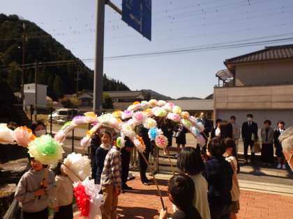 在校生が花のアーチで送ります。