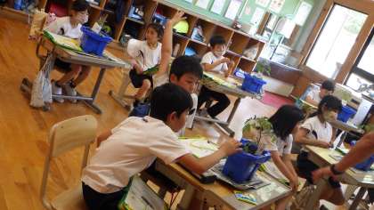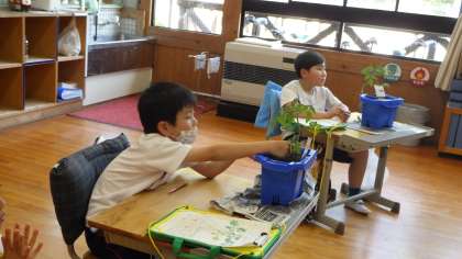 生活科の学習では、ミニトマトの苗を観察しました。前回の観察から変わったところはどこか、どうしたら大きくなるのかをみんなで考えました。