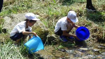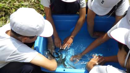 昨年度から巴川漁業協同組合の方と一緒に、アユの放流体験を行っています。今年も、学校近くの足助川で行いました。元気に育って帰ってきてほしいです。