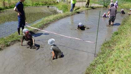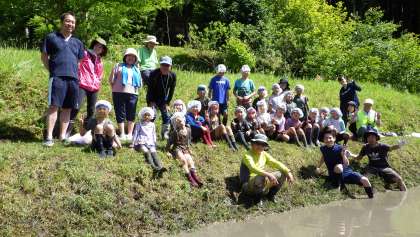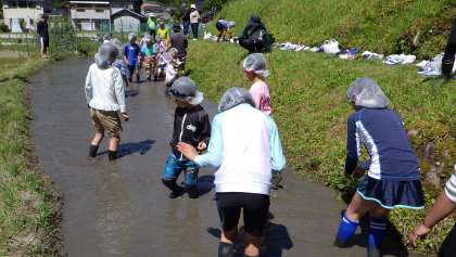 ほふく前進競争やら、生き物探しをする子やら、なぜかフラフープで遊んでいる子やら、それぞれ楽しみました。地域の方も数名見に来てくださり、好天にも恵まれとても楽しく活動できました。