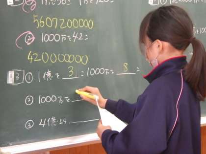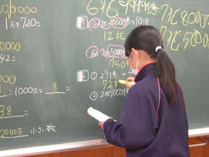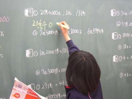 4年生の算数の授業で、「大きな数」という単元を行っています。兆や億など桁数が多いものを計算したり、数字で書いたりしています。