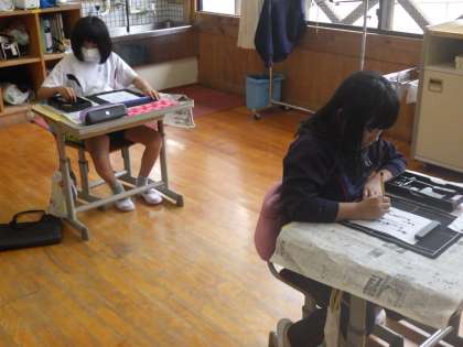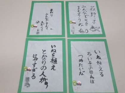 3・4年生の書写の時間に、田植えの経験を俳句の作品にしようということで、固形墨をすって書写の時間に俳句の作品を作りました。自分たちで文字の大きさ、線の太さや配置を考えて作り上げていました。
