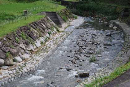 2日(金)は記録的な大雨でしたが、何事もなく元気にあいさつを交わす子どもたちの顔を見て安心しました。下の写真は、学校の裏に流れる今朝の川の様子です。石垣の白くなったところまで川の水位が上がっていたのが分かるかと思います。