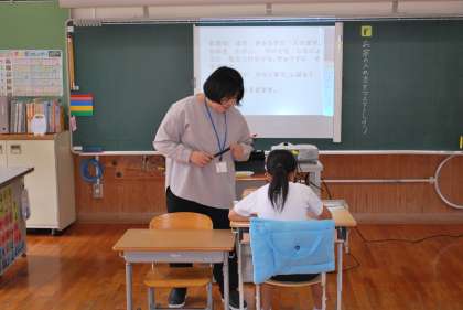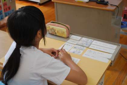 3組の授業です。カードを使っておいしいお茶の入れ方を考えていました。
