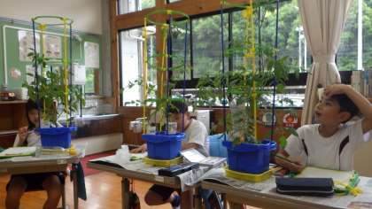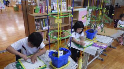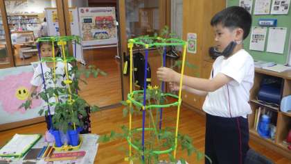 ミニトマトの観察をしました。「前よりくきがのびている」「花や実がついてきた」「さわるとトマトににおいがする」などの発見をして観察用紙に絵や文でまとめました。
