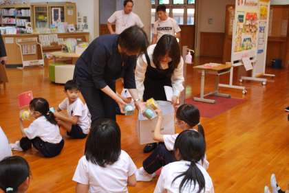続いて本校で絞った醤油をプレゼントしました。すると、領事館の方からもマスコットを一人一つずついただきました。