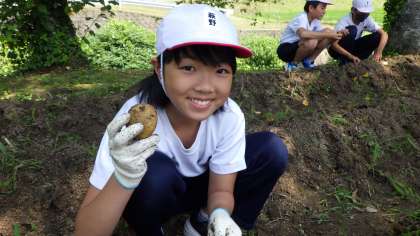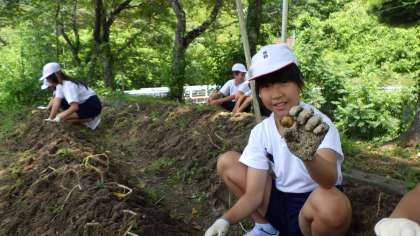 理科の学習のために昨年度に植えたジャガイモを5・6年生で収穫しました。掘ってみると意外と見つからず、掘り当てた時は歓声が上がっていました。
