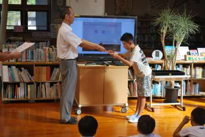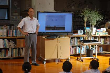 全校朝会(夏休み明け集会)では、校長先生のお話を真剣に聞いていました。お話の最後に、6月に中国総領事館の方々が萩野小を訪問した時の動画が、日中文化交流団体 華豊の友の方によってYOU TUBEにアップされていることを子どもに伝えました。ご笑覧ください。