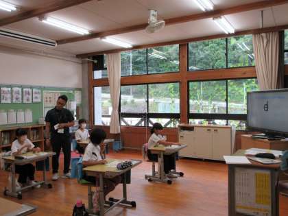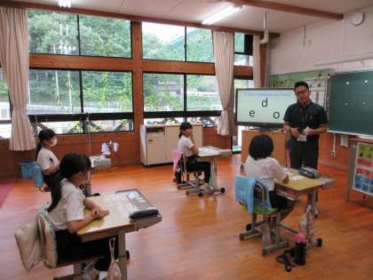 3・4年生の外国語活動の様子です。小文字のアルファベットをマスターしようということで、この形の中に何のアルファベットが隠れているのか一生懸命考えて探しています。
