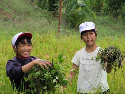 夏休み明け初めて、田んぼの手入れに行きました。田んぼ一面に水草が広がっていました。みんなで力を合わせて草抜き。簡単に抜けるので、楽しく作業ができました。