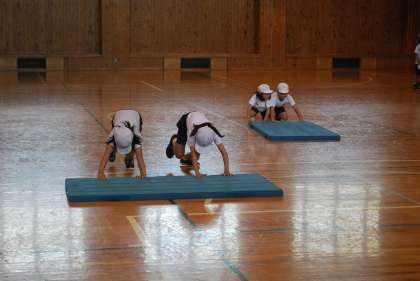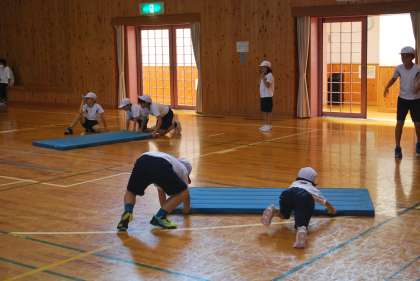 今日から6年生は修学旅行のため、体育の授業は1年生から5年生の合同授業でした。適時、水分補給等の休憩を入れながら「マットリレー」等のゲーム要素を取り入れた運動に親しんでいました。