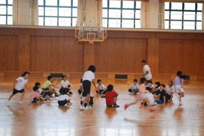給食の後に子どもたちが企画した全校遊びをしました。今回の全校遊びは、小さなカラーコーンをハンカチ代わりにしたハンカチ落としゲームでした。適時給水しながら、先生たちも交えて楽しく遊びました。