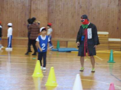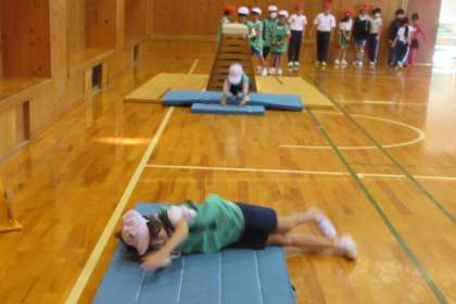 1,2年生は萩野小学校で集合学習を行いました。ふれあいセンターに移動し、「からだほぐしうんどう」をしました。