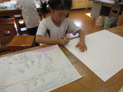 現在、図画工作科では「読書感想画をかこう!」の学習をしています。本の内容から想像をふくらませ、思い思いの世界を描く姿は生き生きとしていました。こんな世界だったら楽しい!と楽しみながら描いている作品、どんな素敵なものになるのかわくわくしますね。