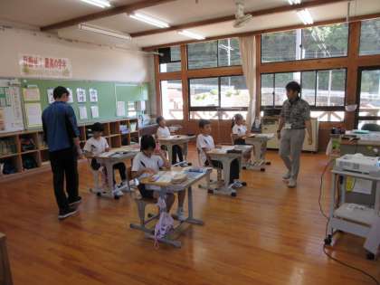 5,6年生の外国語の授業です。ALTの先生と一緒に海の生き物を英語でリズミカルに発音していました。