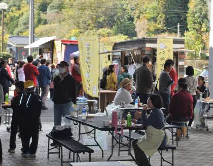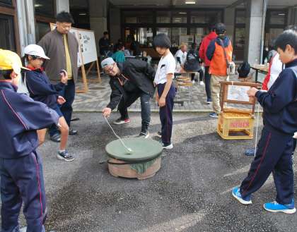 スポーツフェスティバルの後に行われた「第1回ふるさと萩野まつり」の様子です。キッチンカーによる食品販売やコマ回し体験の他、多目的ホールで落語、歌唱、バンド演奏が行われ、地域から多くの方々が本校に訪れていました。