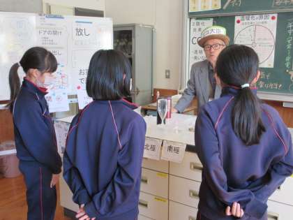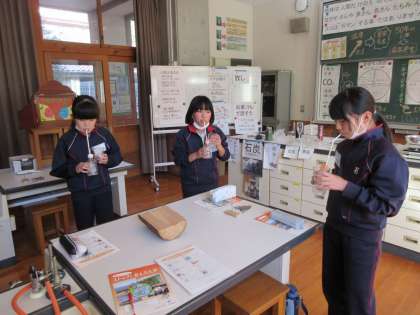 3・4年生のストップ温暖化教室の様子です。地球の周りに二酸化炭素が大量にあることで、地球が暑くなってしまうことを学びました。二酸化炭素を見るために石灰水に息をぶくぶくと吐くことで白くなりました。