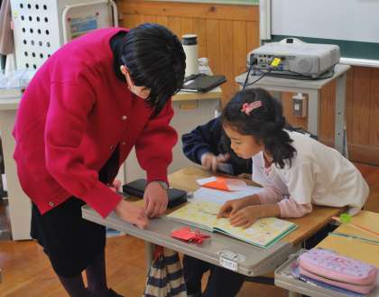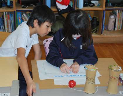 1,2年生がペアになって作ったおもちゃが完成し、遊び方の説明を一緒に考えています。
