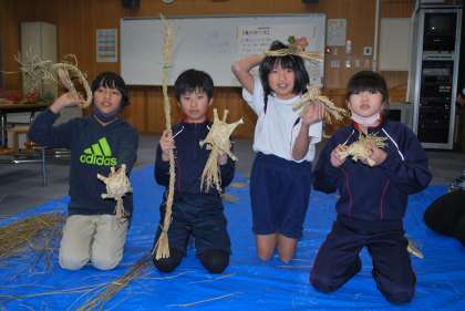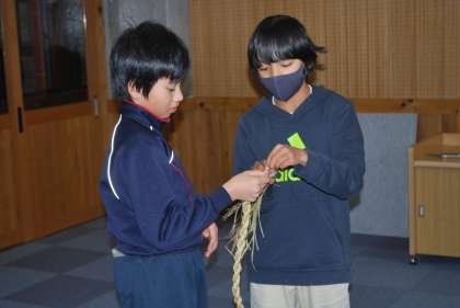 工芸クラブでは、藁で亀を作り終えた子どもは、正月用のしめ飾りを作りました、